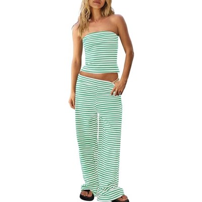 Womens Striped Two Piece Sets Summer Lounge Outfits Sailor Tube Top and Pants Matching Set Beach Vacation Travel Y2k