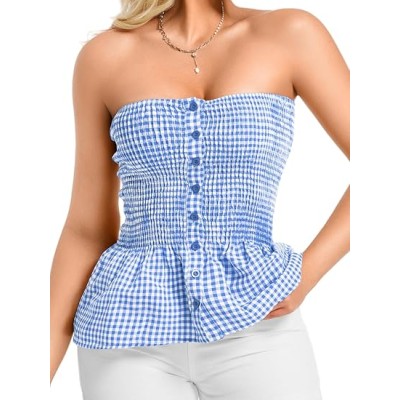 Women's Smocked Ruffle Tube Tops, Cute Gingham Peplum Top, Strapless Shirts for Summer Going Out