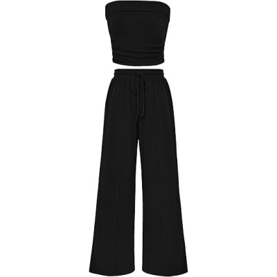 Womens Summer Outfits 2 Piece Sets Casual Ribbed Knit Crop Tube Top Wide Leg Pants Spring Matching Lounge Set
