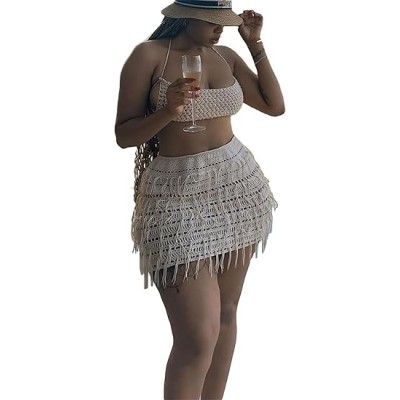Women 2 Piece Outfits Sexy Crochet Mini Dress Hollow Tassel Skirts Sets Summer Bandage Tube Tops