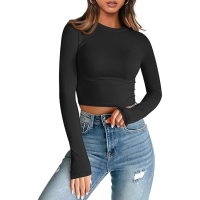 Women Long Sleeve Slim Fit Crop Shirt Ribbed Knit Tops Casual Round Neck Y2K Tees