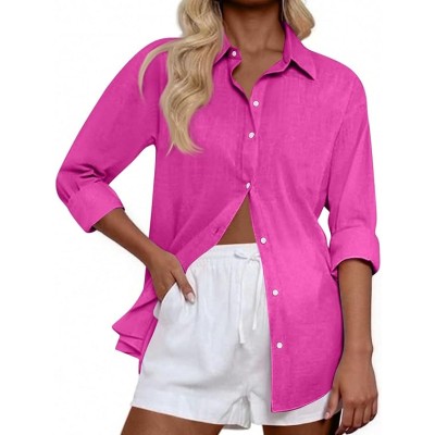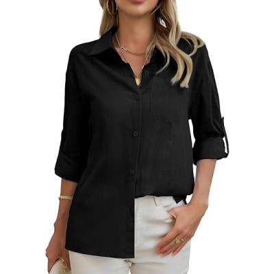 Linen Button Down Shirt Women Long Sleeve Collared Cute Summer Tops Dressy Casual Curved Hem Gauze Work Blouse