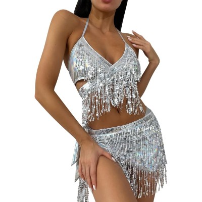 Women's 3Pcs Holographic Sequin Fringe Tassel Skirt Tube Bra Top Shiny Rave Outfits Festival 80s 90s Dancewear Costume