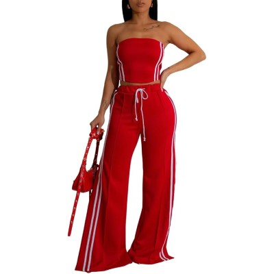 Women's Summer 2 Piece Outfits Strapless Striped Crop Tops & Wide Leg Pants Sets Sexy Two Piece Sets