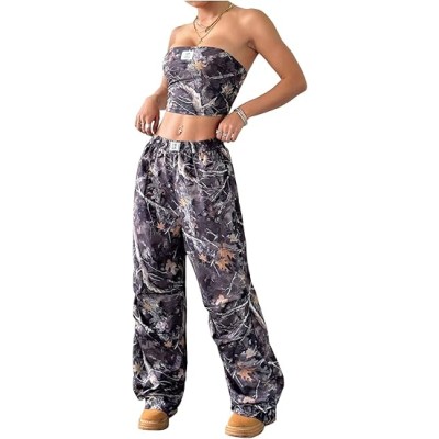 Women's Camo 2 Piece Sets Strapless Baneau Tube Top and Wide Leg Cargo Pants Set Crop Tops Set Summer Outfit