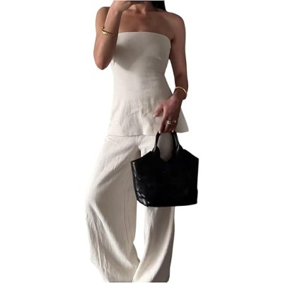 Women's 2 Piece Outfit Strapless Tube Top and Wide Leg Pants Going Out Set