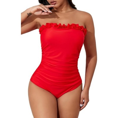 Strapless Swimsuits for Women Bandeau One Piece Bathing Suit Tummy Control Swim Suit Vintage Ruched Ruffle Swimwear