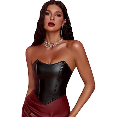 Women's PU Leather Overbust Corset Bandana Tube Tops Lace up Strapless Boned Body Shaper Bustier