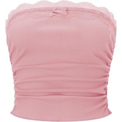 Women Lace Trim Tube Top Strapless Ribbed Ruched Bandeau Y2k Summer Going Out Crop Tops