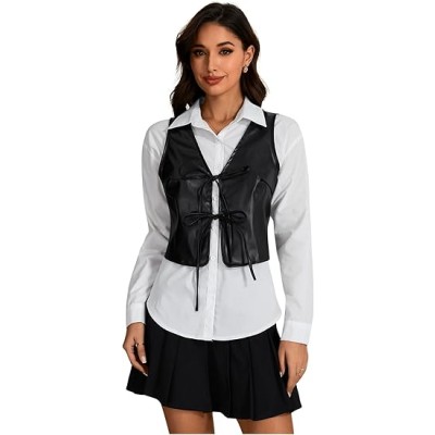 Women's PU Leather Tie Front Vest Sleeveless V Neck Jacket Outerwear