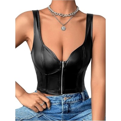 Women's Sexy PU Leather Crop Tank Tops Halter Lace Up Camisole Vest for Casual Party Festival Rave