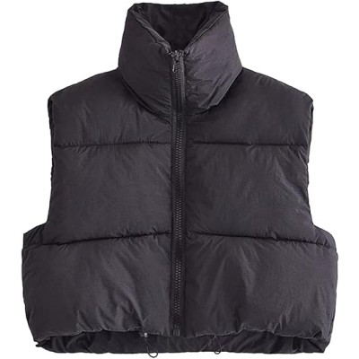 Womens Cropped Puffer Vest Zip Up Stand Collar Sleeveless Padded Crop Vests