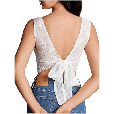Women's Jacquard Tie Back Sleeveless Vest Shirts Crewneck Blouse Tops