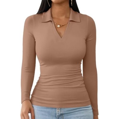 Women Fall Clothes V Neck Shirts Long Sleeve Lapel Tshirts Ribbed Knit Slim Fitted Polo Collar Casual Basic Tee Tops