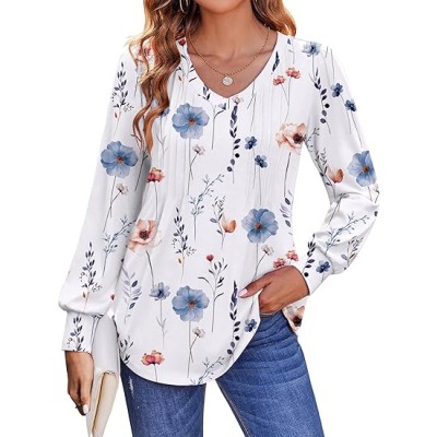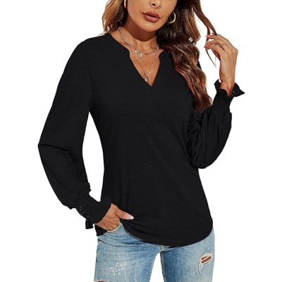 Women's Puff Long Sleeve Shirts Pleated V Neck Fall Tunic Tops Blouse Dressy Casual Loose Summer T-Shirts