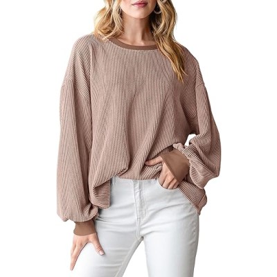 Women's Long Sleeve Tee Shirts Spring Fall Trendy Clothes Casual Loose Crewneck Ribbed Blouse Tunic Tops