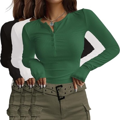 Women's Long Sleeve Shirts 3 Packs Henley Button Down Tops Ribbed Slim Fit Base Layer Soft Thermal Tee