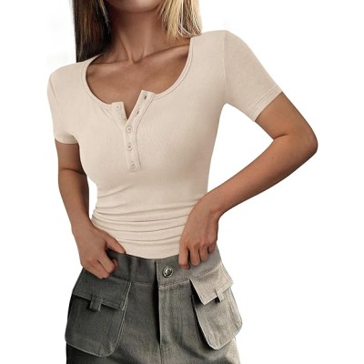 Women's 2025 Spring Summer Short Sleeve Tops Ribbed Henley Button Slim Fit Basic Casual T Shirts Blouse Clothing