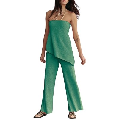 Summer Knit Sweater Sets for Women 2 Piece Vacation Outfits Strapless Tube Top and Pants Sets Matching Lounge Set