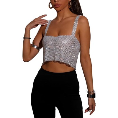 Women Rhinestones Tank Top, Sparkly Deep V Backless Top Hanging Neck Metal Chain, Sleeveless Club Party Clubwear