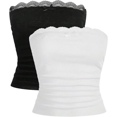 Women's 2 Pcs Contrast Lace Trim Strapless Ruched Crop Tube Top